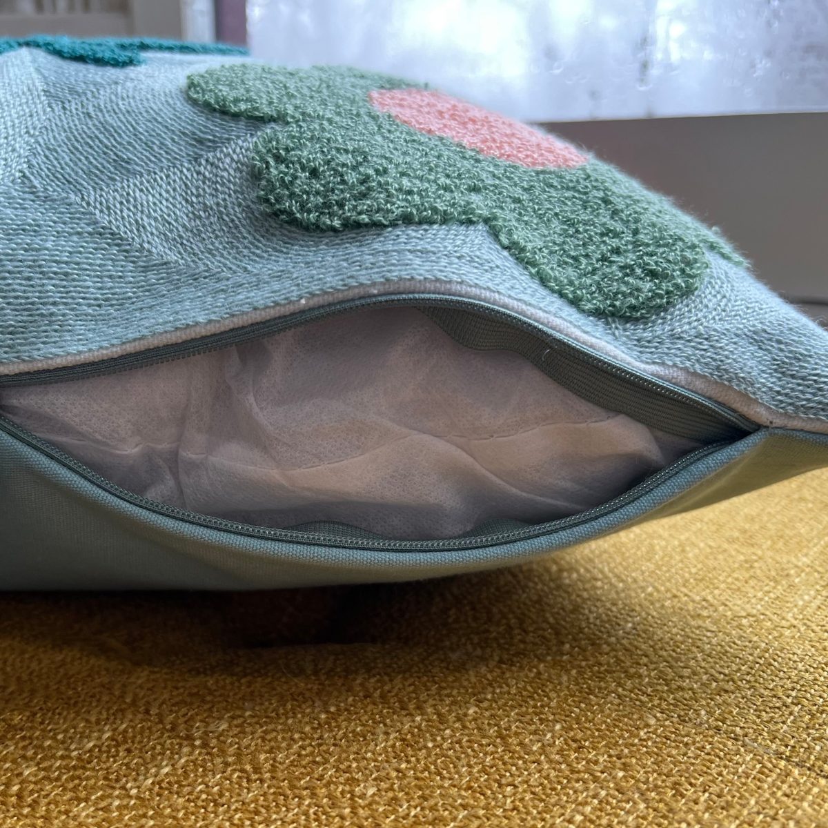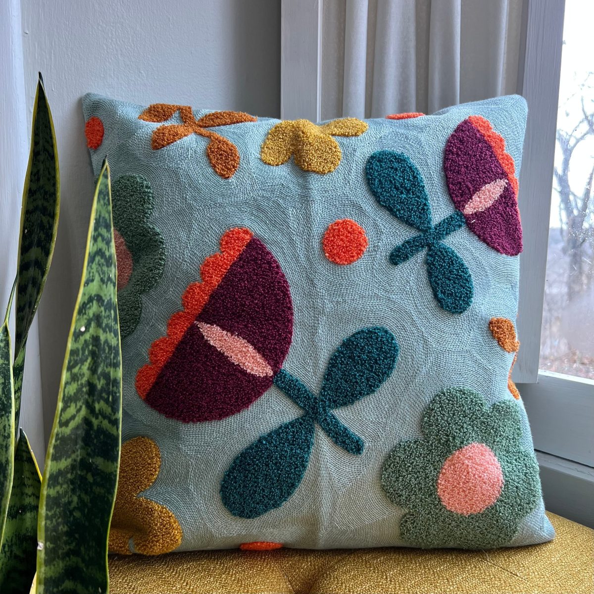 Blue embroidered background and tufted colorful flowers. A great addition for plant lovers and brings your botanical theme into your textured textiles.