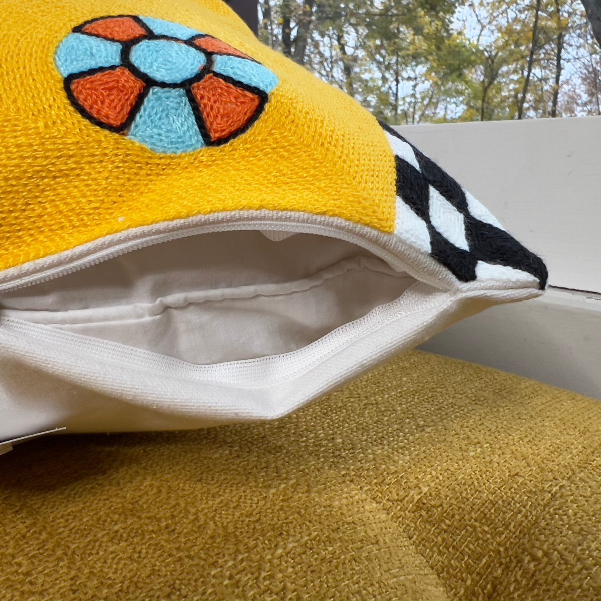 Add personality to your space with this vibrant 18×18 throw pillow featuring a playful cat design. Machine embroidered with bold colors, floral accents, and a retro checkerboard pattern, it’s the perfect blend of charm and style.