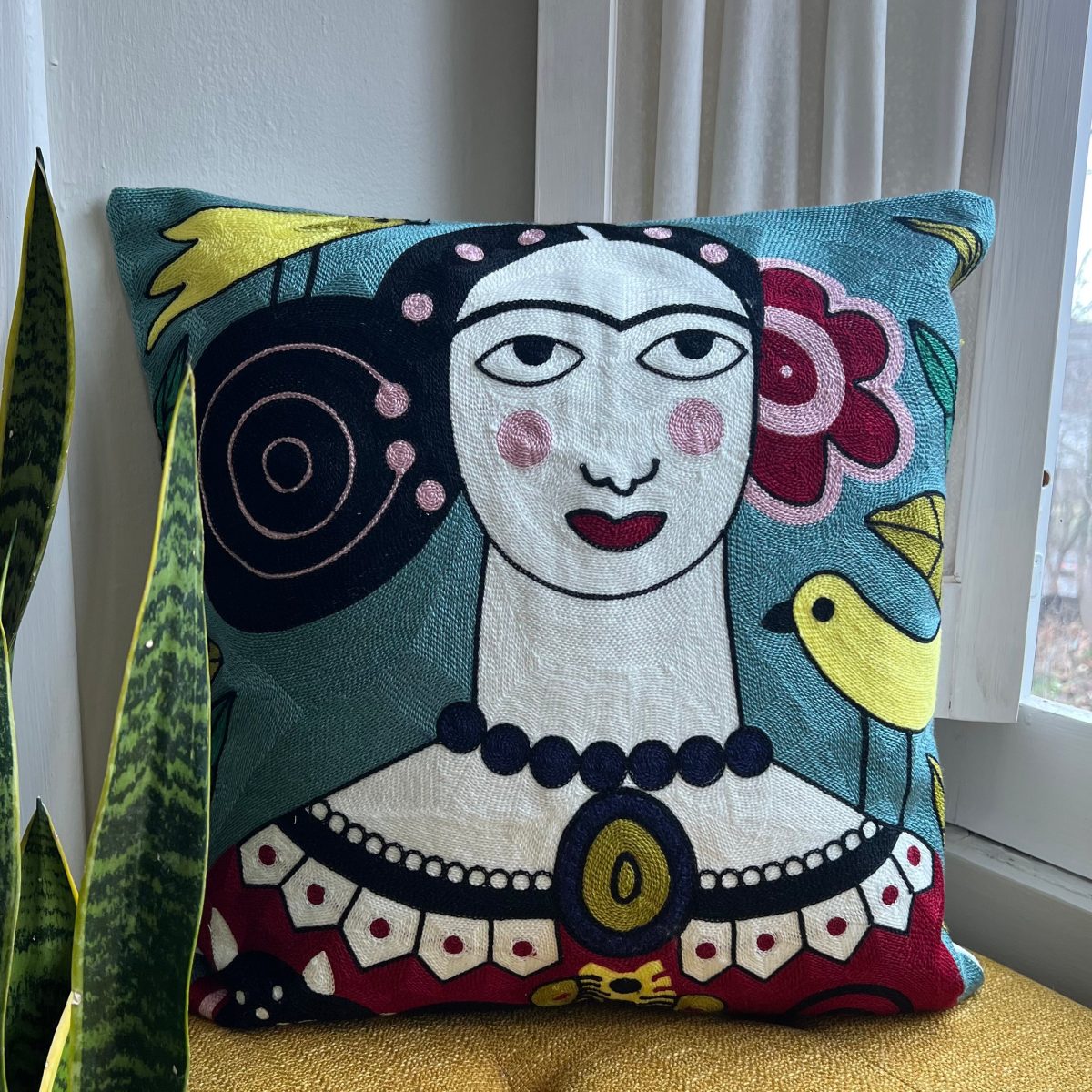 Gorgeous embroidered throw pillow Frieda Kahlo art inspired design. Perfect for adding color and inspiration to your eclectic home!