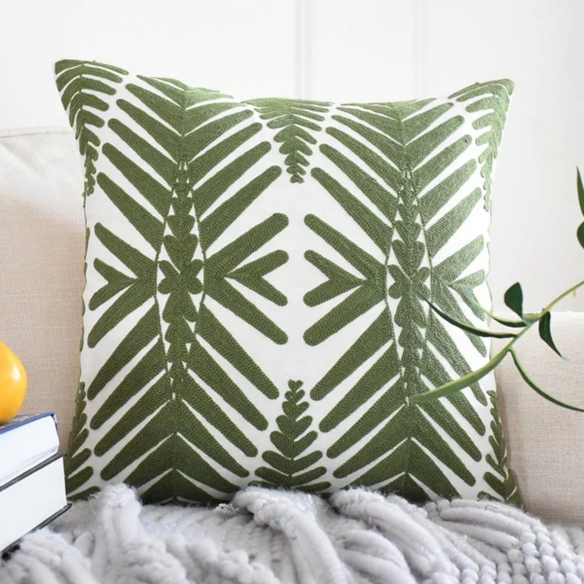 Gorgeous green embroidered fern pattern adorns this thick cotton pillow cover. A great addition for plant lovers and brings your botanical theme into your textured textiles.