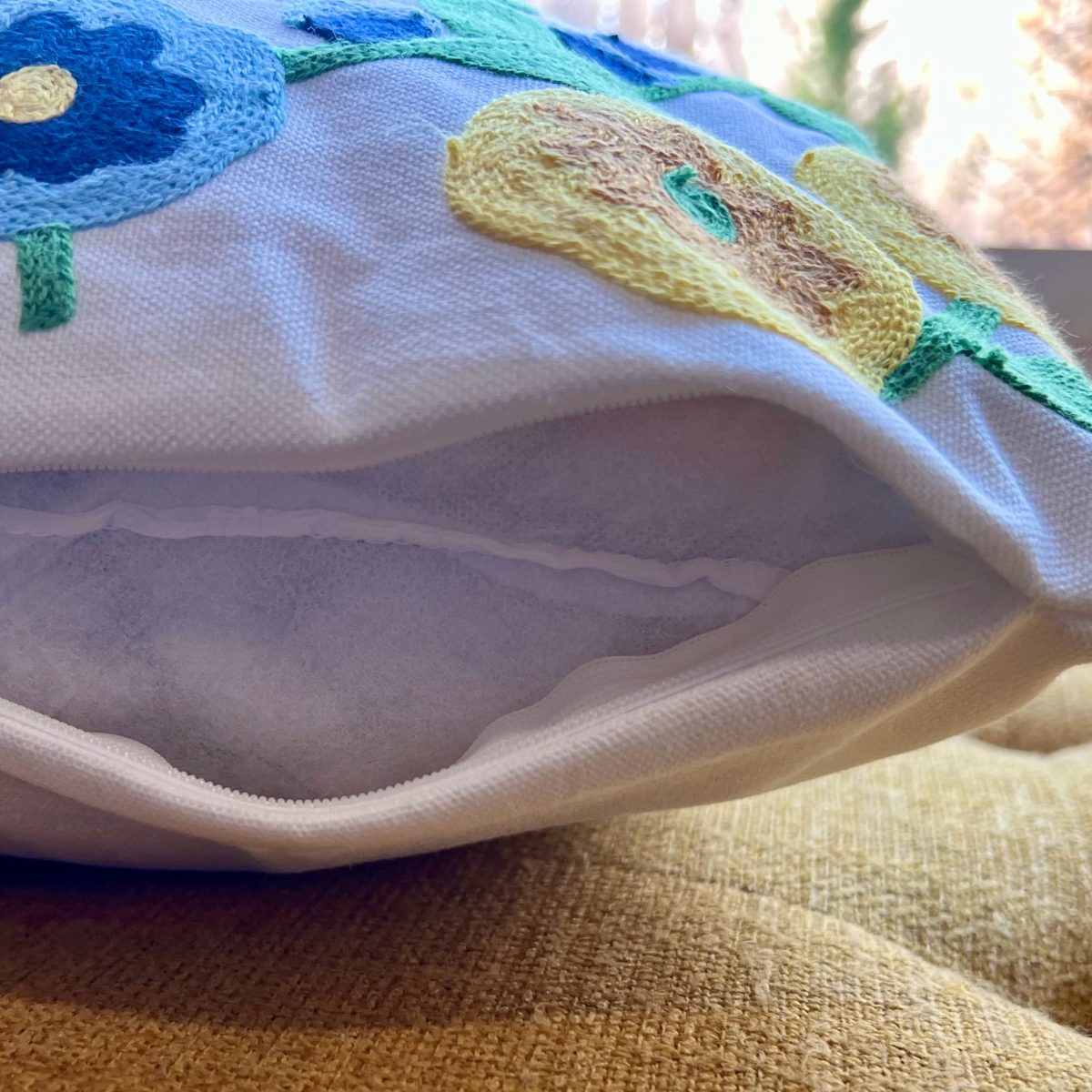 Add a touch of nature’s beauty to your home with the Meadow Flowers Embroidered Pillow Cover. Featuring a vibrant mix of golden buttercups and delicate blue forget-me-nots, this artisan-crafted design brings the charm of a wildflower meadow indoors. Hand-stitched on crisp white cotton, the intricate embroidery creates a stunning textured effect, perfect for adding warmth and personality to any space.
