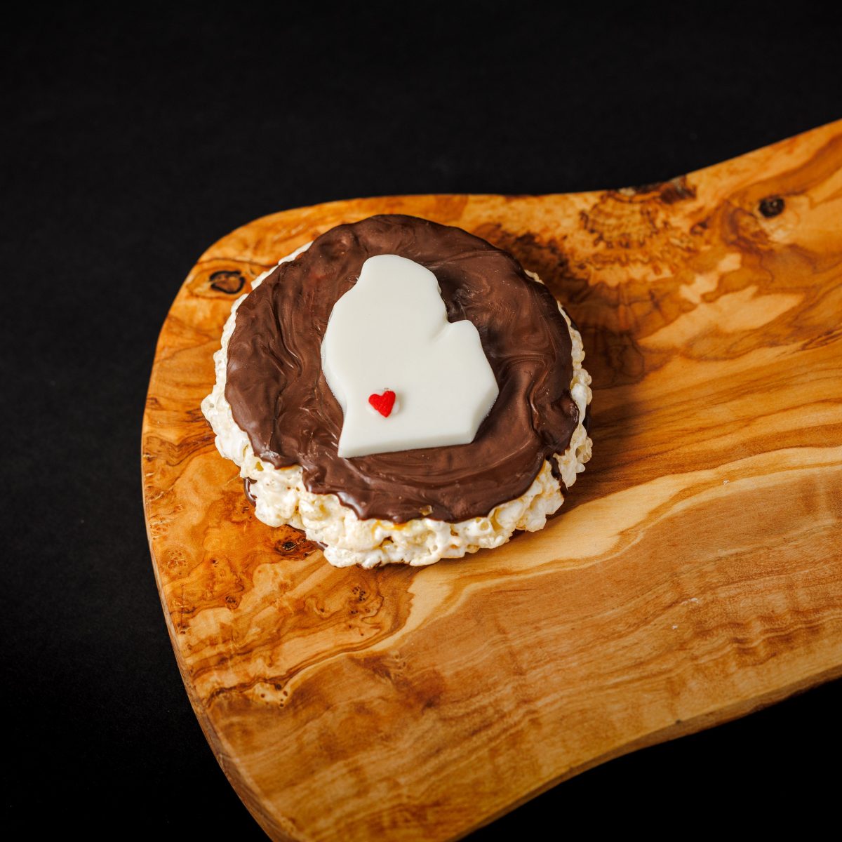 Crisped rice treat coated on both sides with caramel and dark chocolate with a white chocolate Michigan mitten.