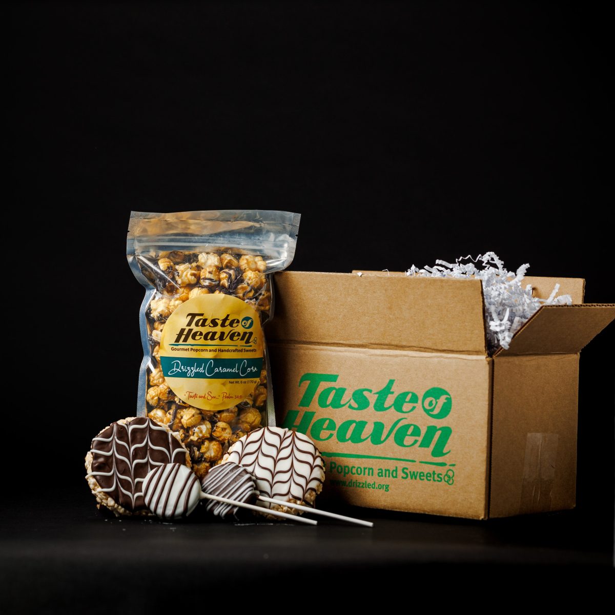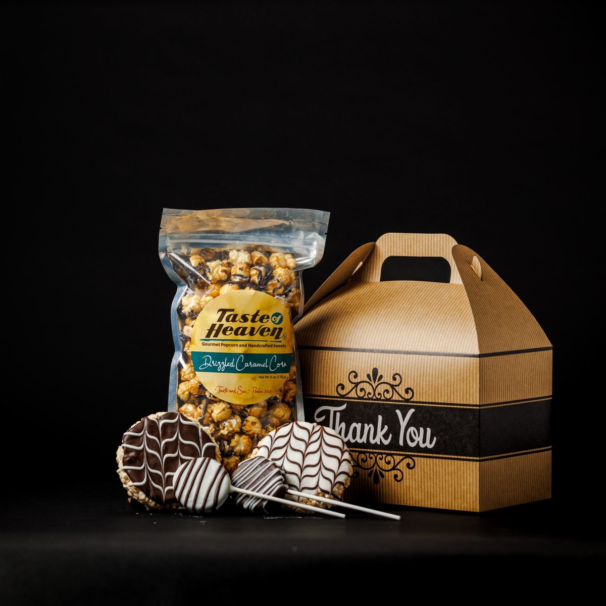 The perfect little gift for someone special! 1 bag of Drizzled Caramel Corn, 2 Dipped Caramel Crispies, and 2 cookie pops.